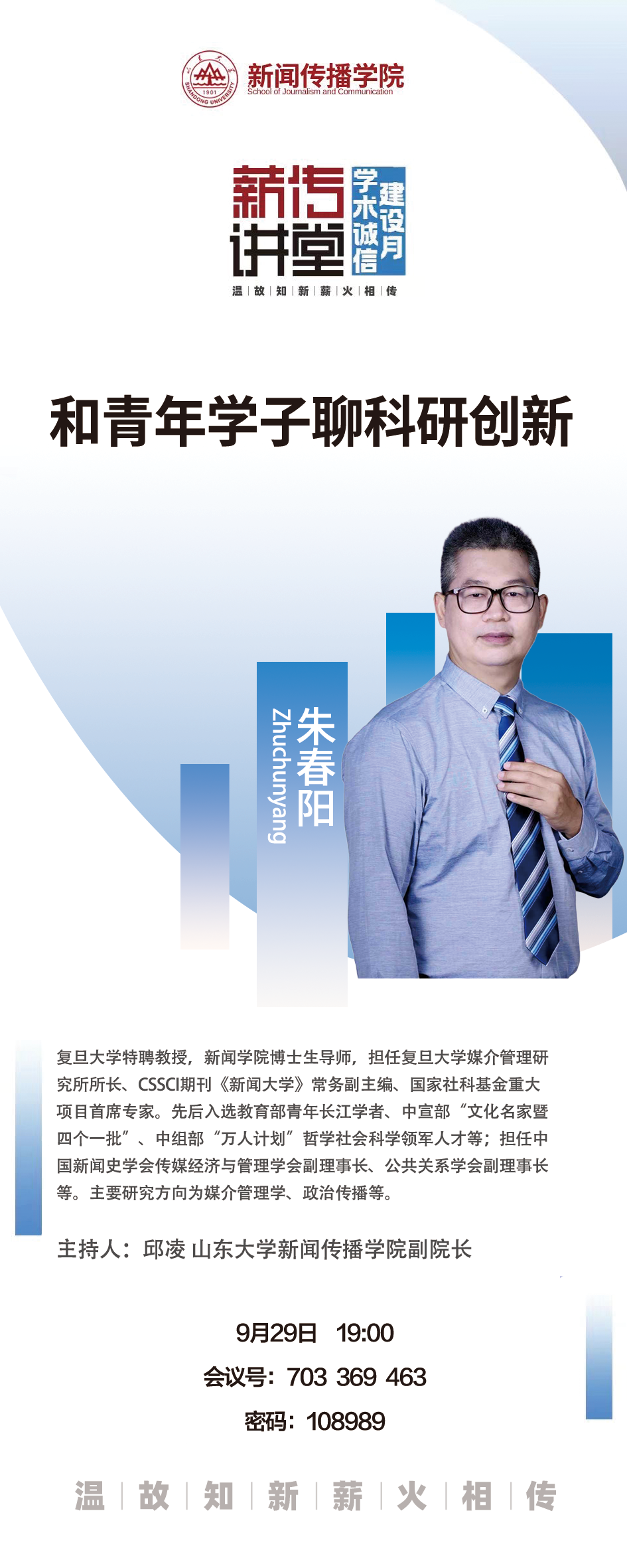 朱春阳,复旦大学特聘教授,新闻公司博士生导师,担任复旦大学媒介管理研究所所长、CSSCI期刊《新闻大学》常务副主编、国家社科基金重大项目首席专家。先后入选教育部青年长江学者、中宣部“文化名家暨四个一批”、中组部“万人计划”哲学社会科学领军人才等;担任中国新闻史学会传媒经济与管理学会副理事长、公共关系学会副理事长等。主要研究方向为媒介管理学、政治传播等。