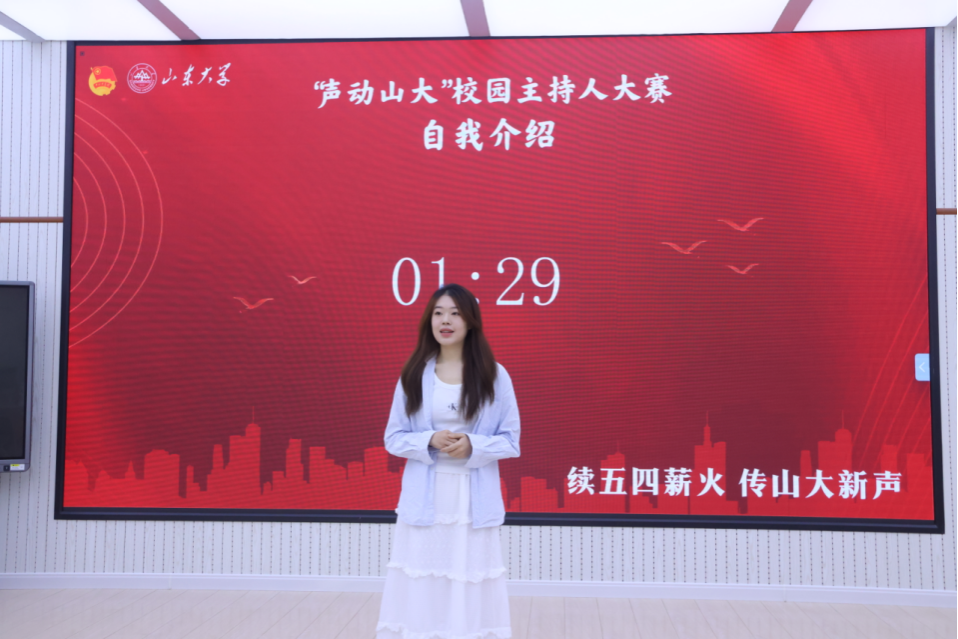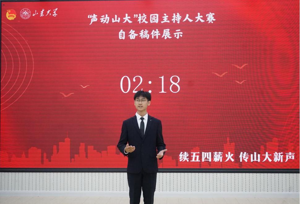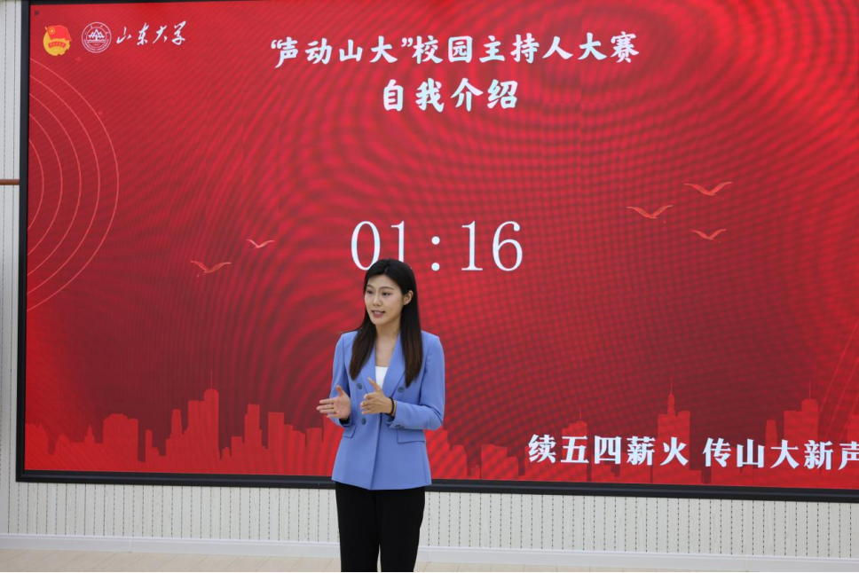 在自我介绍环节,选手们各显才能。有的选手自身经历出发,讲述与主持艺术的结缘之路;有的选手通过模拟主持娓娓道来,寓情于景展示专业素养;有的选手借以一段悦耳的歌唱开场,将艺术特长一并呈现,现场“百花齐放”,展示了山大学子突出的表达能力与扎实的美育素养。