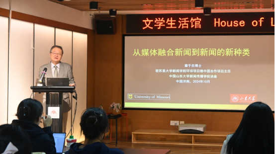 章于炎详细梳理和讲解了融合新闻发展的趋势及其新类别。他深入探讨了当今媒体环境中融合新闻的演变,分析了其在技术和内容上的创新,如多媒体报道和互动式新闻。同时,他还介绍了密苏里大学新闻公司在媒体融合专业方面的教育体系,分享了该专业卓越的教学成果,包括师生们的精彩作品。通过生动的案例分析和实际作品展示,不仅让在场的师生了解了融合新闻的前沿动态,也激励他们积极参与这一充满活力和潜力的领域。