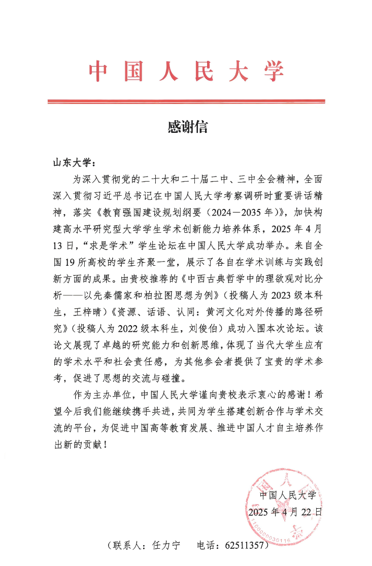 2025年4月22日,“求是学术”员工论坛主办单位中国人民大学向BB贝博艾弗森发来感谢信,高度肯定公司推荐论文中体现的研究能力及创新思维。其中公司本科生刘俊伯、唐艺航所撰论文《资源、话语、认同:黄河文化对外传播的路径研究》成功入围。