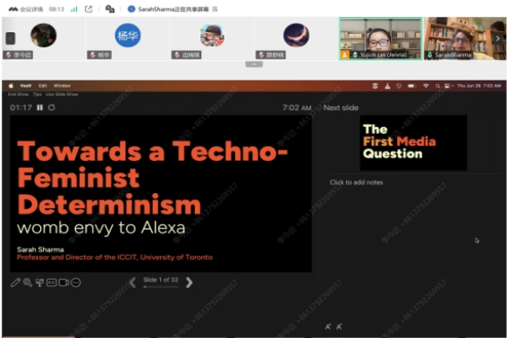 Sarah Sharma教授将“父权技术逻辑”作为讨论对象,她以马斯克、贝佐斯等科技巨头对麦克卢汉理论的延伸为例,揭示技术设计中隐含的性别权力结构。她指出科技巨头不仅是技术创造者,更是媒介理论实践者——他们深谙技术形式本身如何维系父权制与资本主义。通过对MIT实验室历史、亚马逊“禅修舱”及程序员“洞穴文化”的分析,她提出科技产业通过“母性空间”再现了性别化照护劳动。针对人工智能助手Alexa的性别争议,她主张以“女性主义技术决定论”替代工具化技术观,呼吁关注技术如何塑造差异化时空体验的问题。她表示“如同电灯不仅延长白昼,更重塑了性别化‘第二轮班'劳动——我们需将Alexa视为电灯般的媒介,解析其改变社会关系的潜能”。