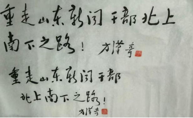 王咏梅教授向方先生汇报说:这个暑假以来,她和员工南下杭州、南京、上海、常州,北上哈尔滨、长春、沈阳、丹东、大连,跨越6省,参观调研了《浙江日报》《新华日报》《解放日报》《黑龙江日报》等7家报史馆或报史长廊,采访了20多位历史亲历者、新闻干部后代及新闻史专家。听完汇报后,方先生说:老解放区新闻工作者“从基层的新闻工作者起步,以无产阶级的立场掌握了新闻报道的手段,比较熟悉地去驾驭和运作,成为解放初期党的新闻事业的骨干力量。”他指出:当代的新闻人应该从他们身上学习“他们坚定的党性原则,要学习他们做一个党的宣传工作者。”并欣然题词:“重走山东新闻干部北上南下之路!”