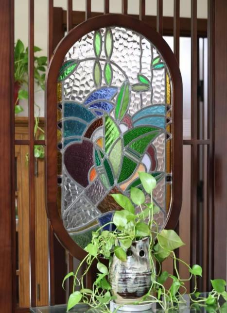 走入于宛霞家中,映入眼帘的是两侧由两块颜色艳丽的玻璃制成的屏风。据她介绍:“这两块玻璃是我在我们家的老房子拆迁时留下来的,每每看到它,就能想起我的父亲,就能想到以往我们一家人一起生活的时光。”