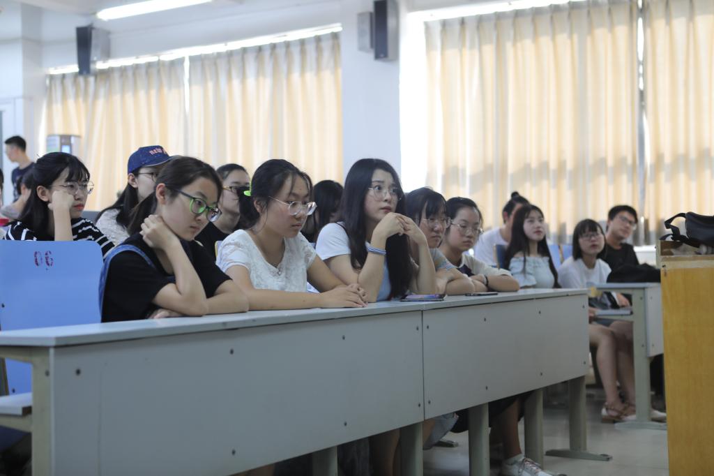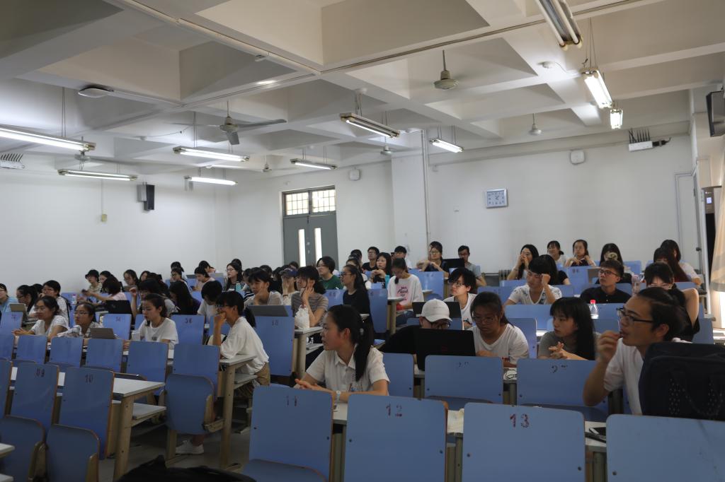 第二部分为心肺复苏的场景模拟演练。实践队使用带来的模拟人,在讲台前真实模拟紧急状况,给在场同学按步骤详细讲解“心肺复苏”的正确做法,从呼救到录像,从按压位置到按压力度,细细叮咛在场同学每一个细节。同学们围着前排,学习十分认真。演示结束后,实践队成员邀请在场同学上台亲自尝试心肺复苏急救过程,手把手教授,各个细节毫不马虎。