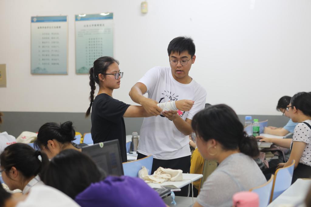第三部分为包扎的学习。在场同学四到五人分为一组,用分发的三角巾和绷带练习包扎。队员通过亲手示范,为在场同学演示了头部、手部、手臂的多种包扎方法。