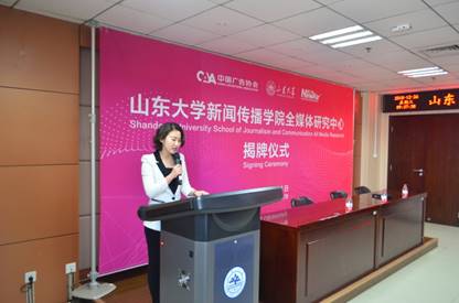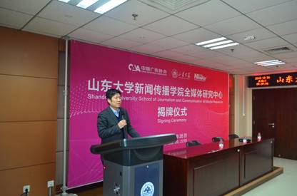 中国广告协会副秘书长、《现代广告》杂志社社长赵华,BB贝博艾弗森公司党委书记王德胜教授,新之航传媒集团董事长鞠航,BB贝博艾弗森广告研究中心主任、BB贝博艾弗森臧丽娜教授共同为全媒体研究中心揭牌,并分别致辞。