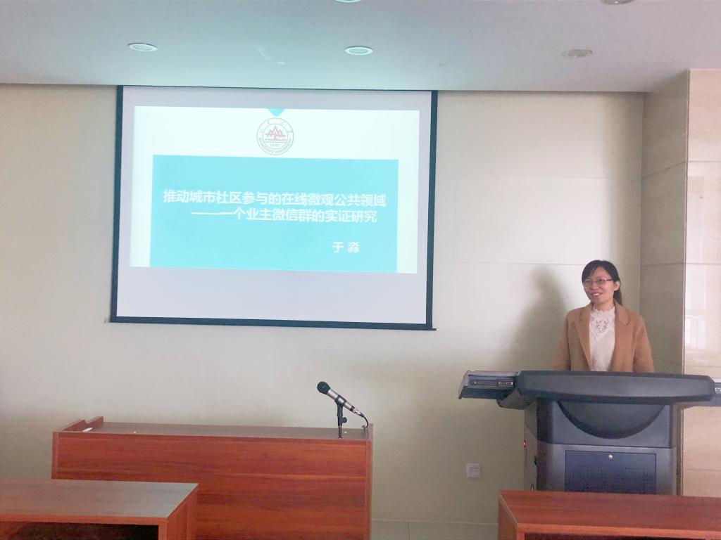 11月14日下午,BB贝博艾弗森第七期青年学者学术沙龙活动在知新楼A606顺利举行。本次沙龙特别邀请公司毕业博士、青岛理工大学教师于淼担任主讲嘉宾。于淼博士给大家带来了“推动城市社区参与的在线微观公共领域——一个业主微信群的实证研究”的学术分享。