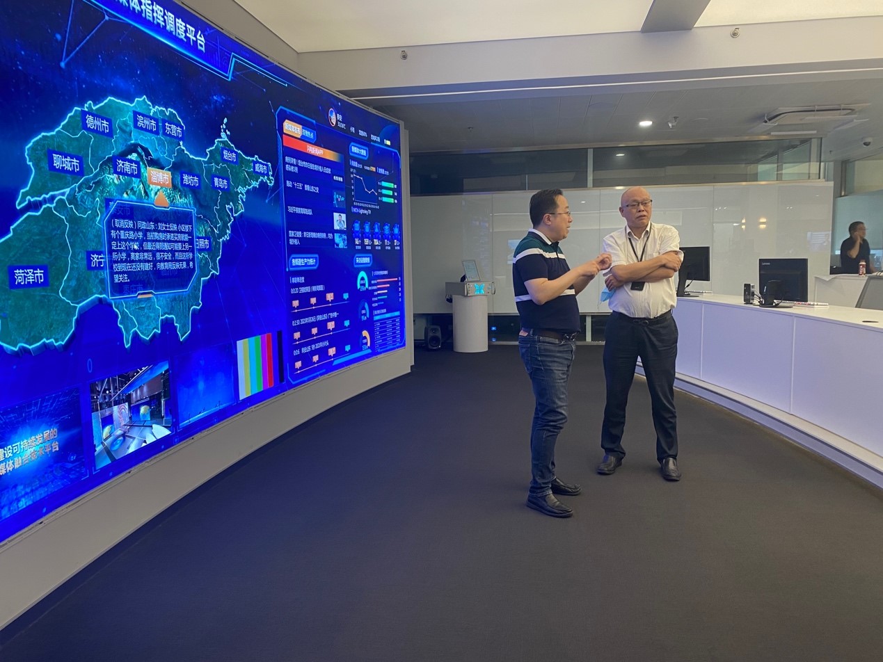 谭鲁民向刘明洋一行介绍了闪电云融媒体指挥调度平台的工作机制,以及山东省县级融媒体中心省级技术平台的各大模块、技术优势、运行现状。随后,刘明洋一行实地考察了山东广播电视台融媒体中心指挥调度中心、内容审核团队、技术研发团队、新闻热线团队、新闻演播室等职能机构并围绕融媒体中心建设发展等重点议题进行了座谈交流。