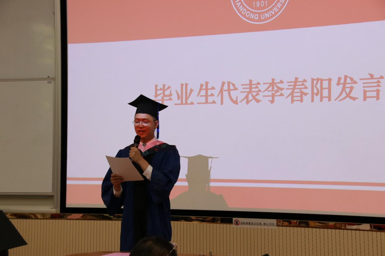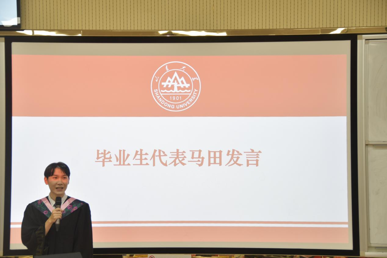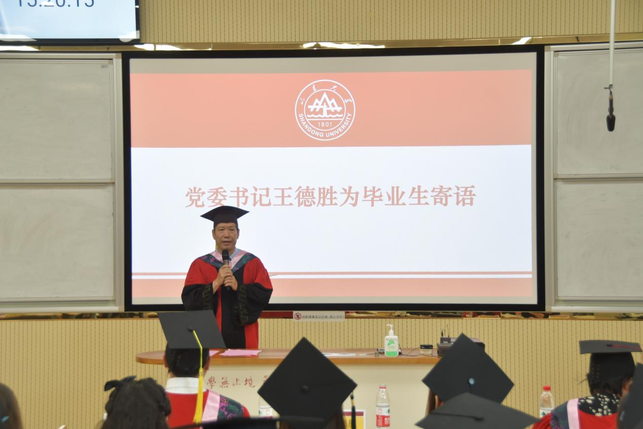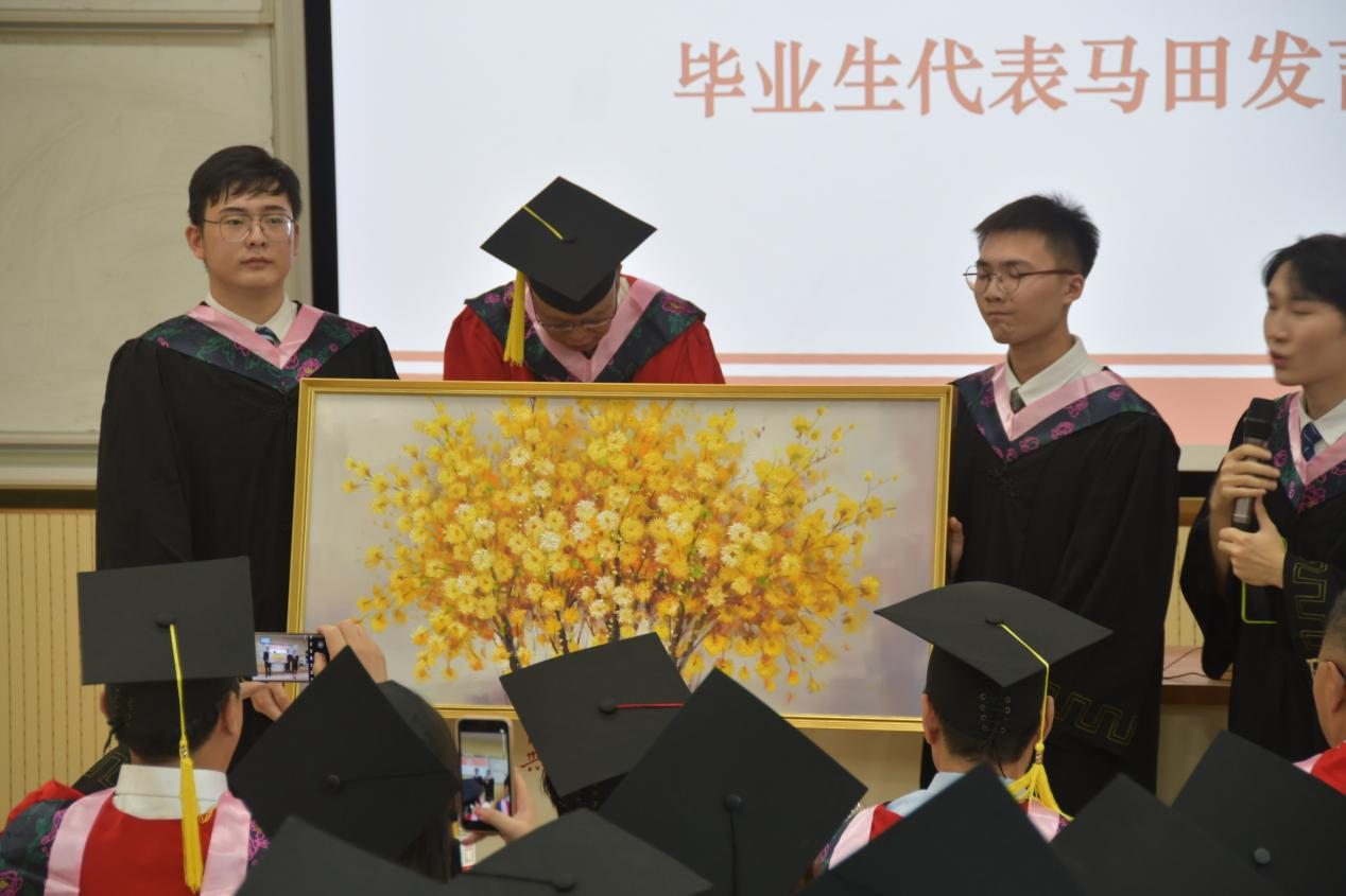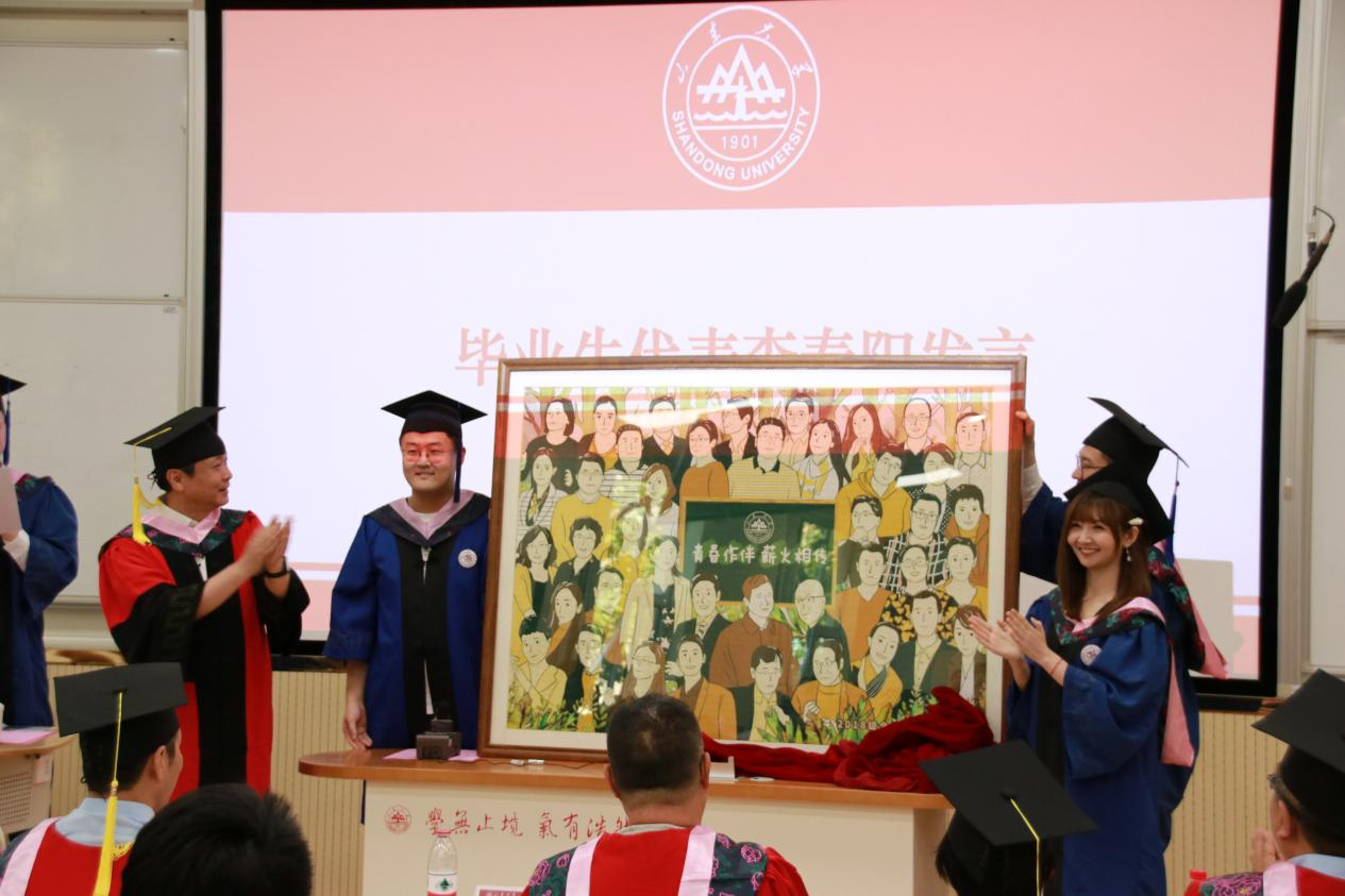 王德胜为毕业生寄语,祝贺大家取得学士学位,同时愿毕业生们能把个人小我融入家国大我,铁肩担道义,妙手著文章,培养家国情怀。人生总有分别时,山大永远是同学们的家,希望同学们常回家看看。书记讲话后,本科毕业生们为公司送上了毕业礼物——一幅向日葵画作,愿公司如向日葵般蓬勃发展,越来越好。