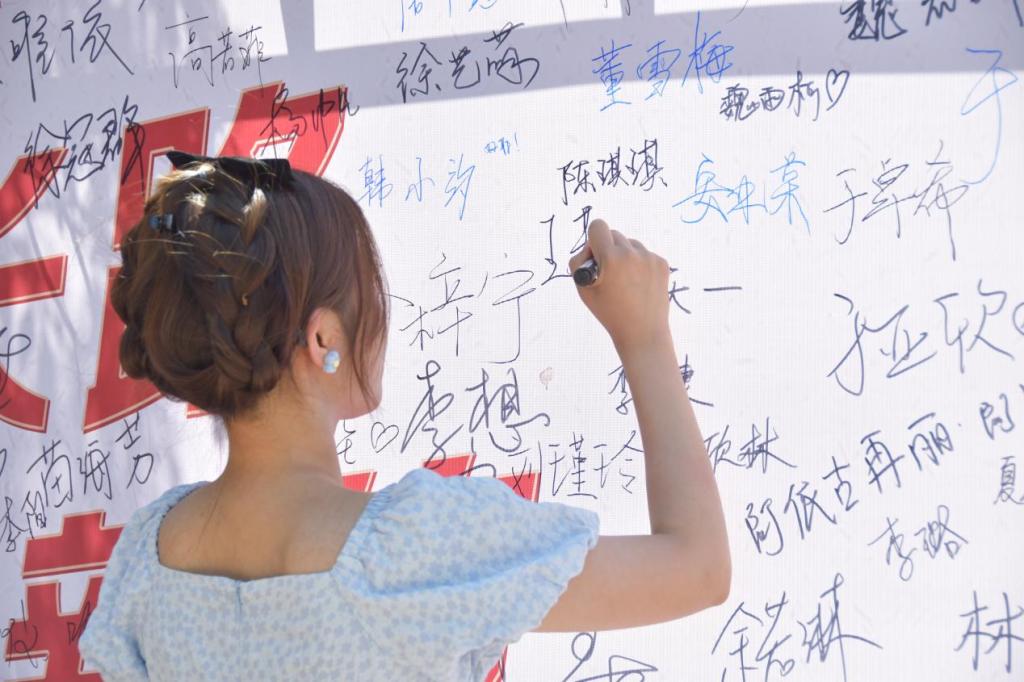 下午两点,“红毯秀”正式拉开帷幕。2021届毕业生们先后伴着歌声走过花团簇拥的红毯,在签名墙上留下自己的毕业印记。随后,吕芃、王德胜,刘明洋带领院领导班子与教师代表踏上红毯,与员工们共庆毕业。