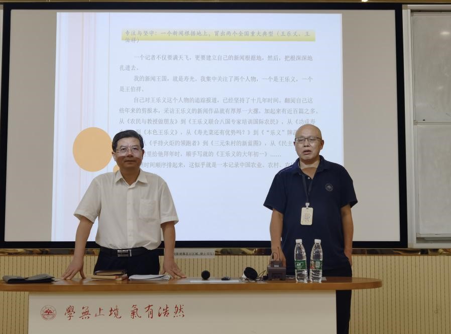 崔永刚又分享了寿光市三元驻村党支部书记王乐义的典型故事。既作为报告人又作为新闻人,他在王乐义的报道宣传中充分发挥着双重角色优势。作为大众日报的记者,崔永刚深入农村大棚,积累新闻剪报,对王乐义进行追踪报道与事迹宣传;作为王乐义宣讲团的一员,崔永刚与王乐义在北京人民大会堂同台作报,又赶赴全国各地进行巡回报告。崔永刚用“三大三小”来形容王乐义:名气很大,架子很小;做事很大,做官很小;贡献很大,报酬很小。他表示,王乐义作为党的基层干部,作为党支部书记,作为中国农民群体中风向标式的人物,身上浓缩着中国三农发展的风云;而他作为一个新闻人,感动于王乐义的最美奋斗,更非常有幸追踪报道了这一切。