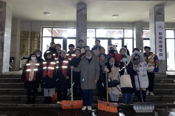 公司团委负责人、辅导员杨璐和同学们一起参与工作,大家手握扫雪专用的铁锹将道路中央的积雪和冰块转移到两侧不妨碍通行的位置。尽管天寒地冻,但大家齐心协力,干的热火朝天,气氛热烈。