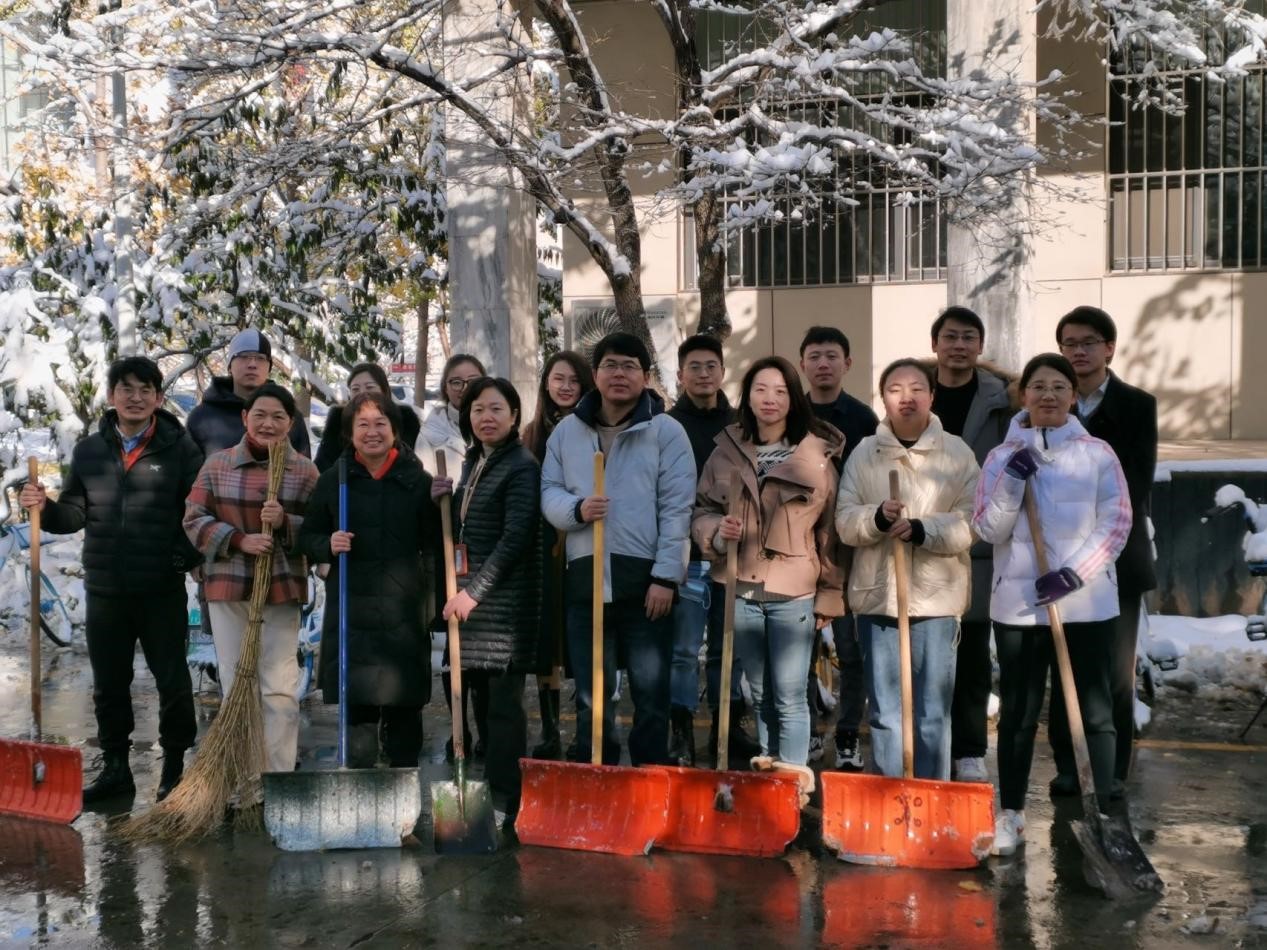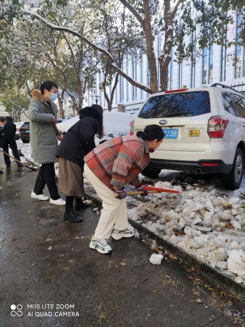 在生命南楼前,师生们迎着寒风,挥舞着长长的铁锹,宽宽的扫帚,上下翻飞。公司内不时传出铁锹与地面的摩擦声,夹杂着扫帚的沙沙声,奏响了一曲快乐的冬日扫雪歌。大家齐心协力将楼前路段路面积雪逐片进行清扫,铲除路面积冰,有的在奋力铲除道路积雪,有的则在清除车辆周边残留的雪和冰块,整个场面热火朝天。