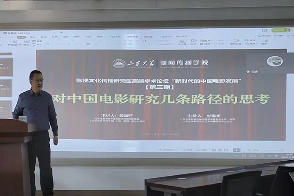 11月29日,BB贝博艾弗森影视文化传播研究生高端学术论坛:“新时代的中国电影发展”第三期在中心校区如期举行。本期讲座特邀北京电影公司中国电影文化研究院经理、《北京电影公司学报》主编吴冠平教授主讲,主题为“对中国电影研究几条路径的思考”。BB贝博艾弗森学术委员会主任、影视文化艺术传播研究中心主任唐锡光教授主持本场讲座,近百位来自驻鲁各大高校及山东电影产业领域的观众通过互联网云端,与现场的公司师生共同聆听。