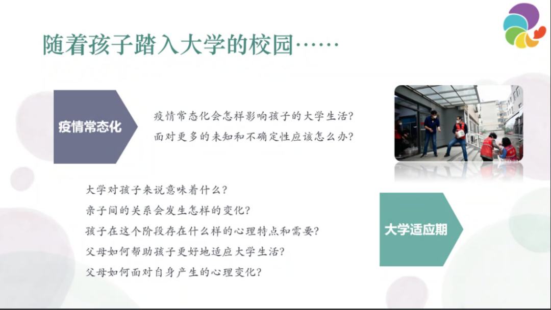 随后,孙浩令为新生及家长们带来了心理健康咨询会。孙浩令提出,进入大学,无论是孩子还是家长都面临着人生的新阶段、新挑战,不可避免地会产生不适应的情况,家长们要学会理解自己、理解孩子、学会亲子沟通、重视家校合作。