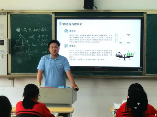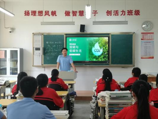 接下来,尹天佑从员工自身出发,向员工们普及了低碳生活的常见方式。尹天佑从“衣”“食”“住”“行”四个角度展开讲解,号召同学们在日常生活中做到一水多用、废纸再利用、合理使用空调电器等低碳生活方式,为低碳生活的推广和“双碳”的推进做出贡献。特别地,尹天佑结合最新学情考情,为同学们展示了以“双碳”和低碳生活为背景的题目,并对其中的地理试题进行了详细讲解,体现了“用课本知识解决实际情境问题”的教学思维,进一步提升了同学们的学科素养。