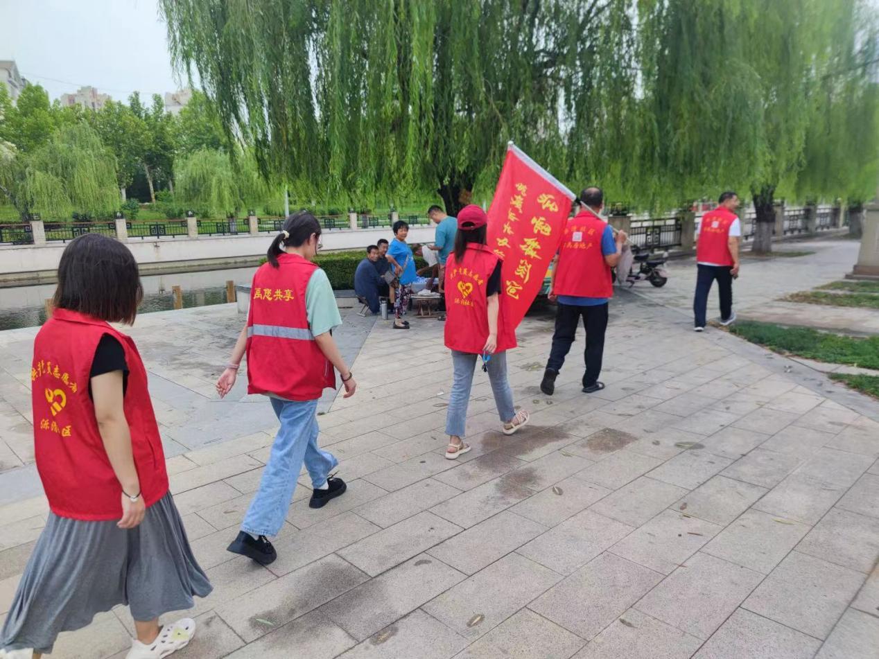 每天到达岗位后,首先要进行卫生清洁,然后便开始巡河之旅。我和同事们穿着志愿者马甲,举着旗帜围绕泺清河巡查,主要目的是检查水况,督促民众远离危险水域,避免溺水事件发生。为了更好地宣传防溺水,社区在河边每隔一段距离设置了红色的横幅,时刻提醒民众关注自身生命安全。结束巡河之后,我们回到社区服务处坐班,每天都有不一样的琐碎,但是也有不一样的快乐和收获。