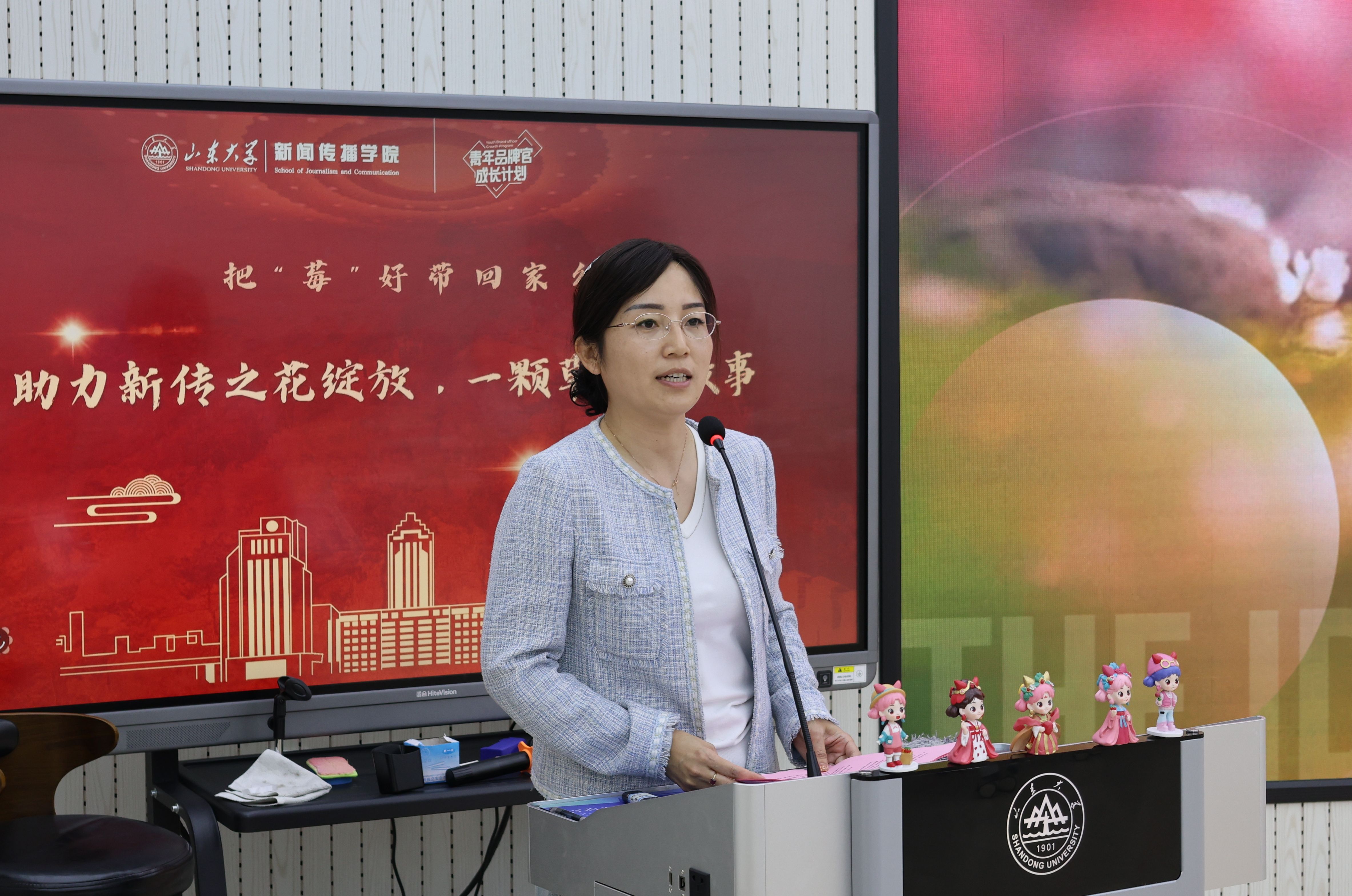 在“助力新传之花绽放”员工企业家分享环节,山东省草莓协会秘书长、济南市农业产业协会副会长、山东泉心农业科技发展有限公司总经理刘莹以“一颗草莓的故事”为青年师生进行了主题分享。刘莹从乘风起航、落地执行、未来可期三个方面出发,介绍了标准化、品质化、品牌化、数字化的草莓智慧农业。泉心农业通过发展草莓产业,与农民合作共赢,改善了当地老百姓的生活。她表示,面对农业市场发展的挑战,泉心农业当回归核心需求,以优质农产品为核心,打造品质高、口感好、有安全的草莓品牌,并关注产地服务,让好的土地种出好的果子。未来将覆盖1万亩草莓种植,进一步打造“莓妃”品牌,通过农业科技、智慧赋能、供应链等方式,打造差异化的农产品IP。最后,刘莹希望广大学子积极投身乡村振兴,在祖国的土地上发挥价值。