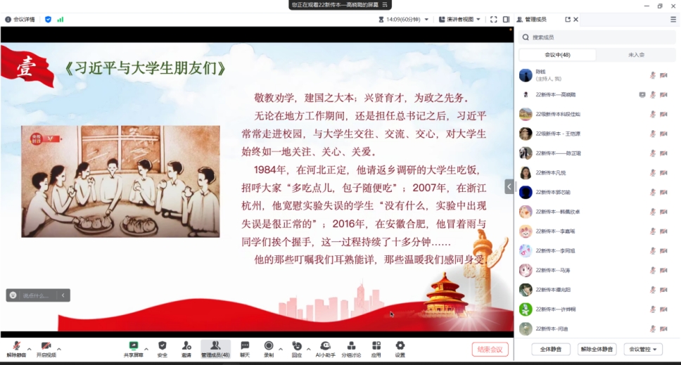 2022级本科1班团支部组织同学们前期自行阅读书籍《习近平与老员工朋友们》,并开展线上读书会对作品进行讲解与阅读感悟分享,通过对习近平总书记的思想进行深入学习讨论,真正做到让学习入脑入耳入心;