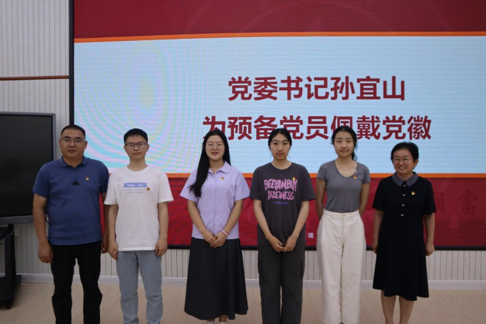 随后,孙宜山、王丽君为本科生党支部新吸收的预备党员佩戴党徽。