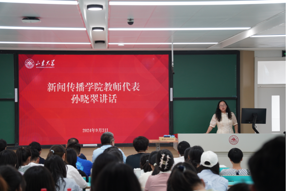 随后,2024级新生代表衷晓晓表达了对人生开启新章节的憧憬。她通过回忆中学时代的成长经历、联系当下节点、展望未来发展,呼吁大家坚定新传理想,明确自我目标,号召大家“坚守自我的底线逻辑、培养一份专业的媒介素养、享受思想与灵魂的碰撞”。