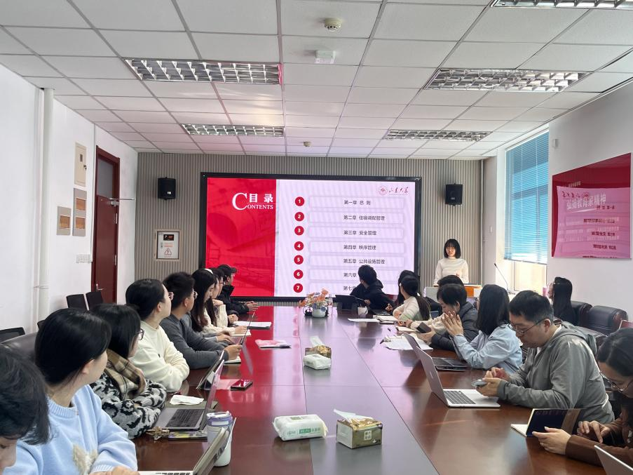 会议伊始,王潇萌领学了公司关于宿舍安全的文件精神,强调宿舍安全是校园安全的重要基石,全体师生需高度重视,严格遵守规定,共同营造安全、和谐的宿舍环境。