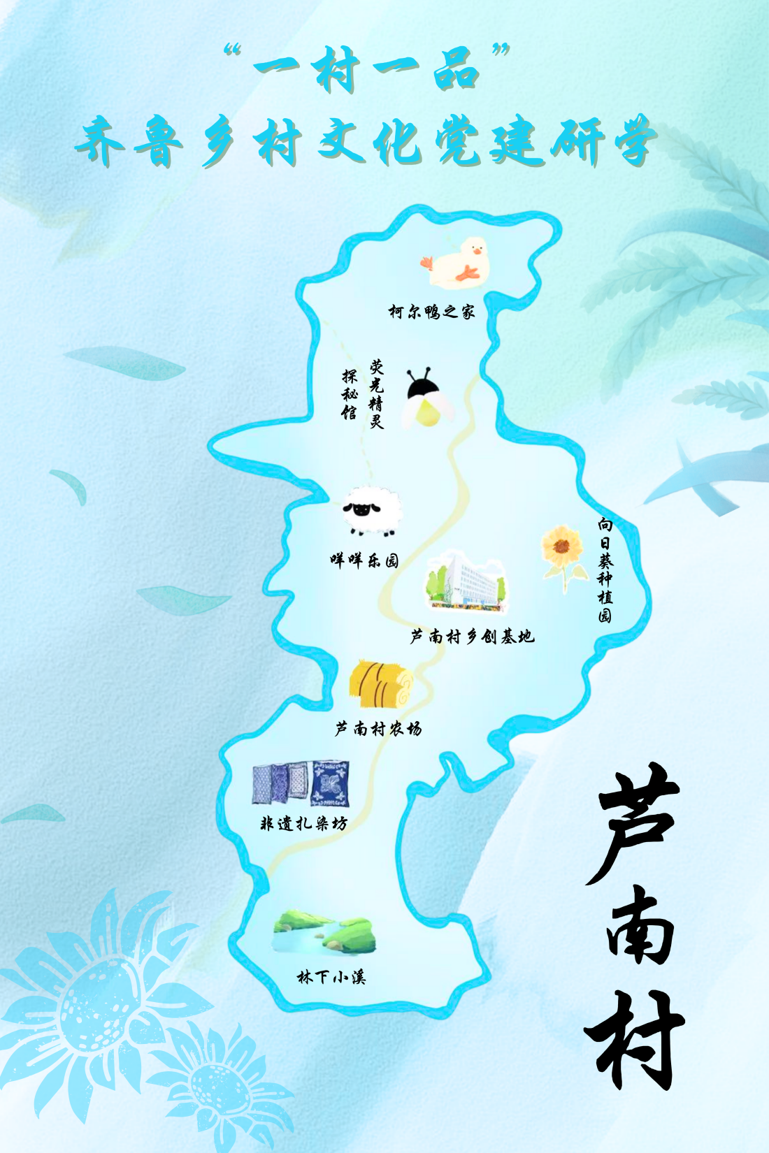 一条条整洁道路通向农家院落,一处处产业园区带动村民增收,一项项治理举措构建幸福生活。芦南村的振兴之路,是齐鲁乡村嬗变的缩影,也是新时代中国乡村发展的生动注脚。实践结束后,团队成员深有感悟,根据芦南村发展特点为其设计了“一村一品”专题文旅地图。