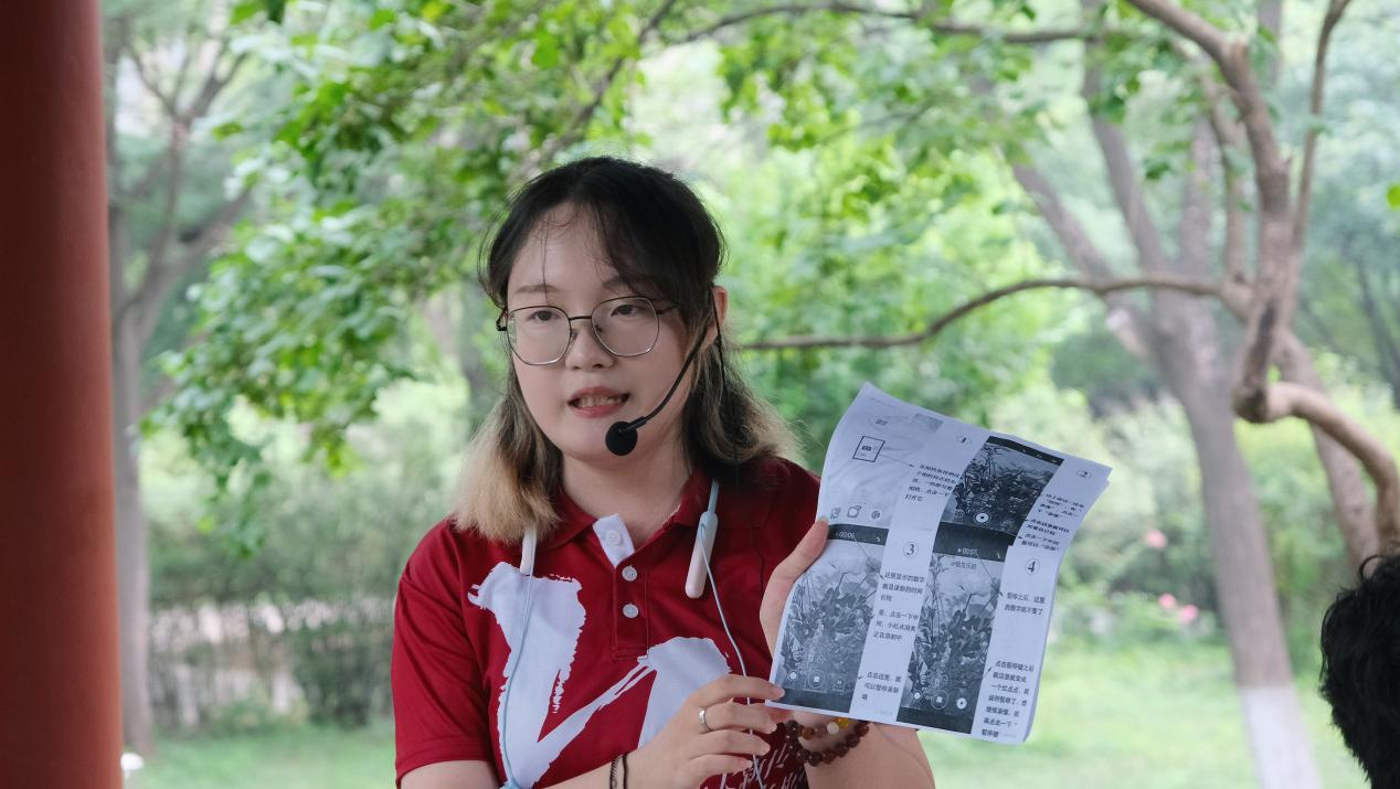 随后,马玉珍结合中心花园实景,重点讲解推、拉、摇、移、跟、绕六种基础运镜方法,并现场演示每种运镜方法的操作步骤:讲解“推镜头”时,镜头从亭子整体缓慢推进至石凳上的水瓶,展示突出细节的方式;示范“跟镜头”时,以拍摄一名行进的成员为例,生动呈现跟拍的方法与技巧。