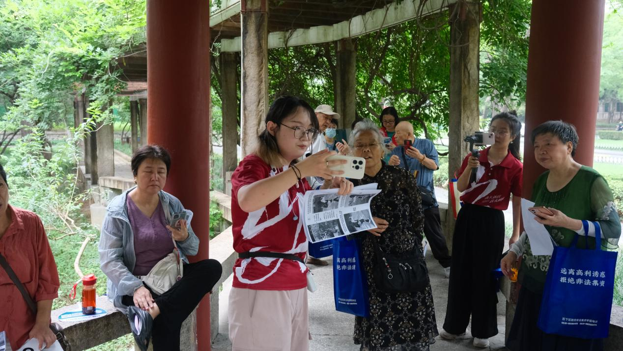 理论教学结束后,老人们以中心花园标志性景观——假山为拍摄主体,分组开展实地拍摄练习。有的小组尝试用“绕镜头”拍摄假山全貌;有的用“跟镜头”记录同伴的欣赏状态;还有的通过“推移结合”展现假山与周边绿植的层次关系。团队成员针对学员们的拍摄成品及时给出建议,耐心指导并解答疑问。