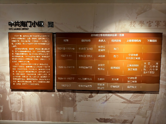 台州第一个党组织纪念馆位于椒江区葭沚老街的丁介士旧宅与卖鸡巷陈宅,为两座清代二层木构合院建筑,占地2300平方米。馆内核心展陈聚焦于1924年宣侠父创建的中共海门小组:包括宣侠父受中共杭州支部委派而重返母校发展金辅华等5名青年入党、建立台州首个党组织、揭开浙东南革命序幕等几大重要历史事件。展区分为“初心启航地”“传奇宣侠父”等四大板块,纪念馆通过展示油印机滚筒墨迹、《新青年》批注本等文物,结合声光电技术来呈现台州党组织发展史及温岭暴动等斗争历程。
