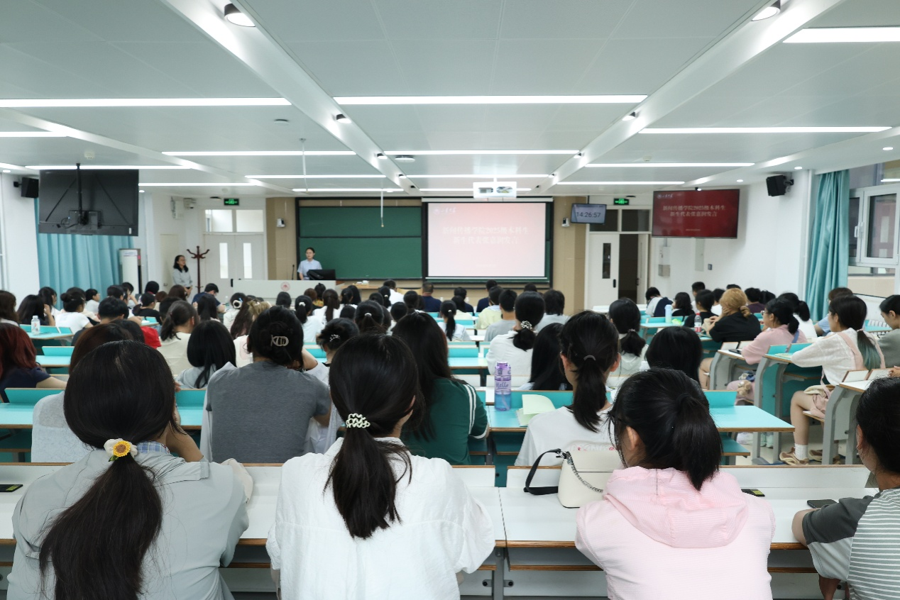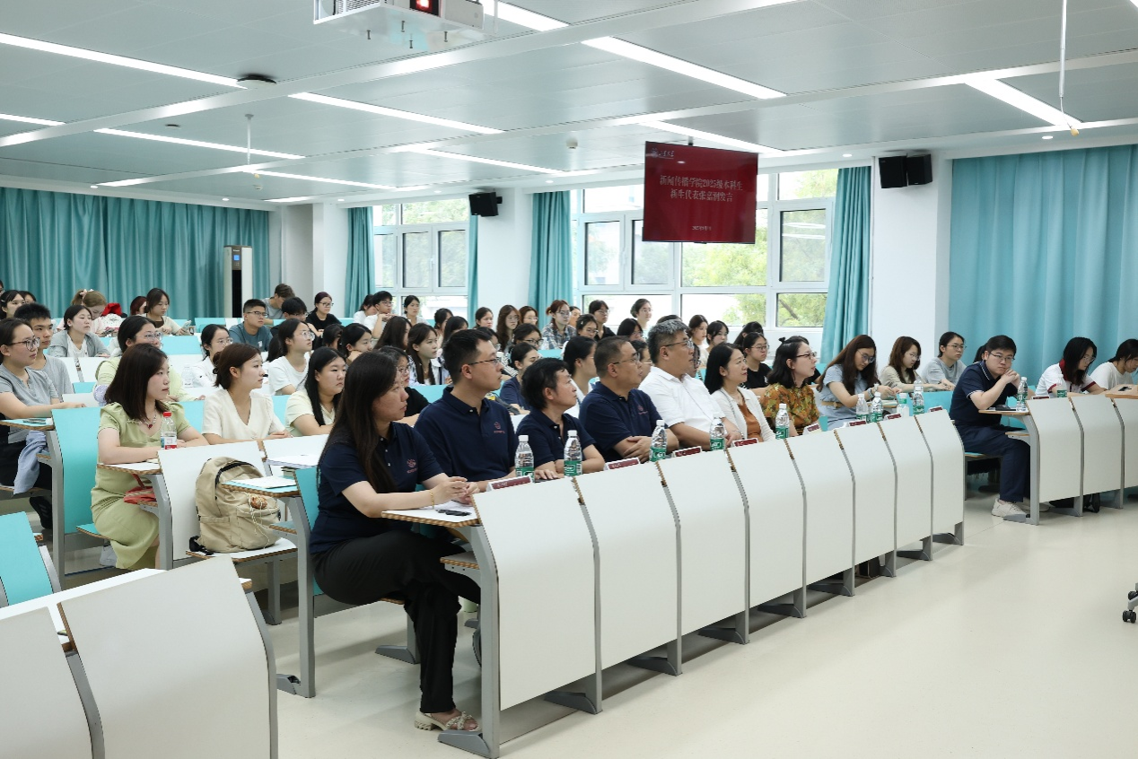 会议伊始,韩若冰作为教师代表和新生们讨论了三个问题:为何学习、如何成长、面对怎样的未来。“古之学者为己”,韩若冰首先提出学习的目的是完善人格、提升素养。她希望新生在深耕专业的同时,拓展人文社科、科学艺术知识,开阔视野,丰盈思想。其次,谈到如何成长,韩若冰认为不要人云亦云,不要盲目崇拜,做到自我精神强大,勉励新生建立和培养批判性思维,在信息多变的时代保持清醒的头脑。最后,韩若冰指出,数智时代更需要具有创造力、审美力、共情力和批判性思维的人才,同学们要主动拥抱技术,朝着洞察社会、兼具科技、与人和谐的方向努力。