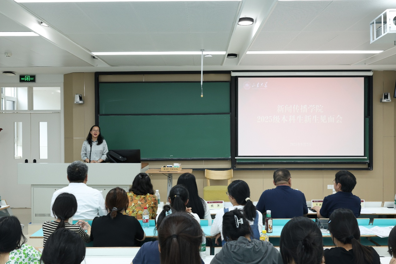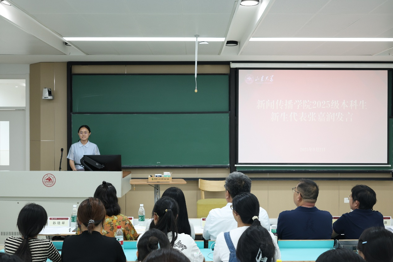 随后,2025级新生代表张嘉润围绕梦想表达了对人生新征程的期待。她以“铁肩担道义,妙手著文章”为初心注解,坦言作为新一代“山大新传人”,既深知新闻传播工作承载的社会责任,也渴望以青年视角传递时代声音。她号召在场同学,既要在课堂上夯实专业基础,练就辨别信息真伪的“火眼金睛”,也要在实践中主动贴近生活,用有温度的文字、有力量的影像,记录身边的奋斗故事、传递社会的正向能量,用有温度、有力量的声音为新时代添砖加瓦!