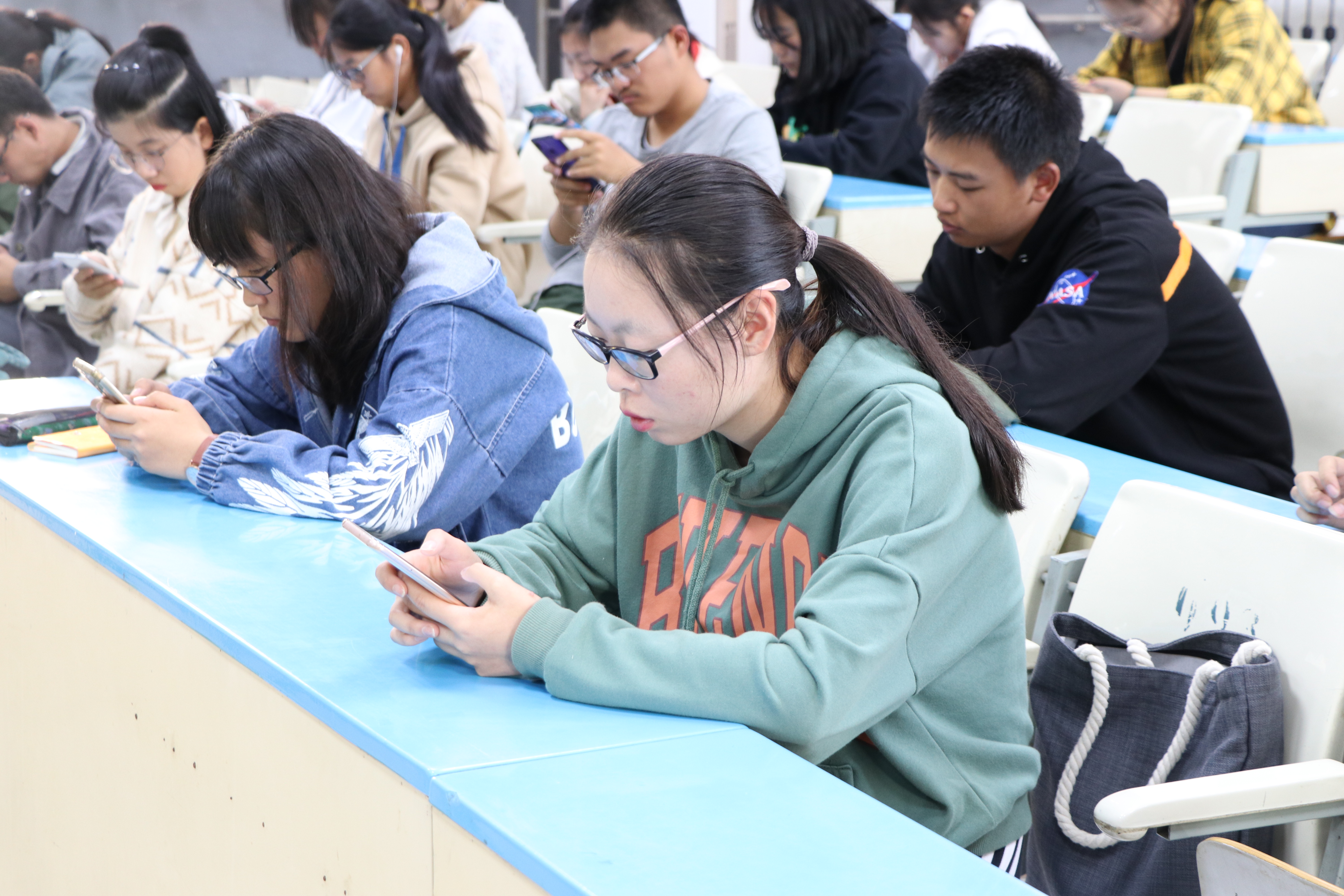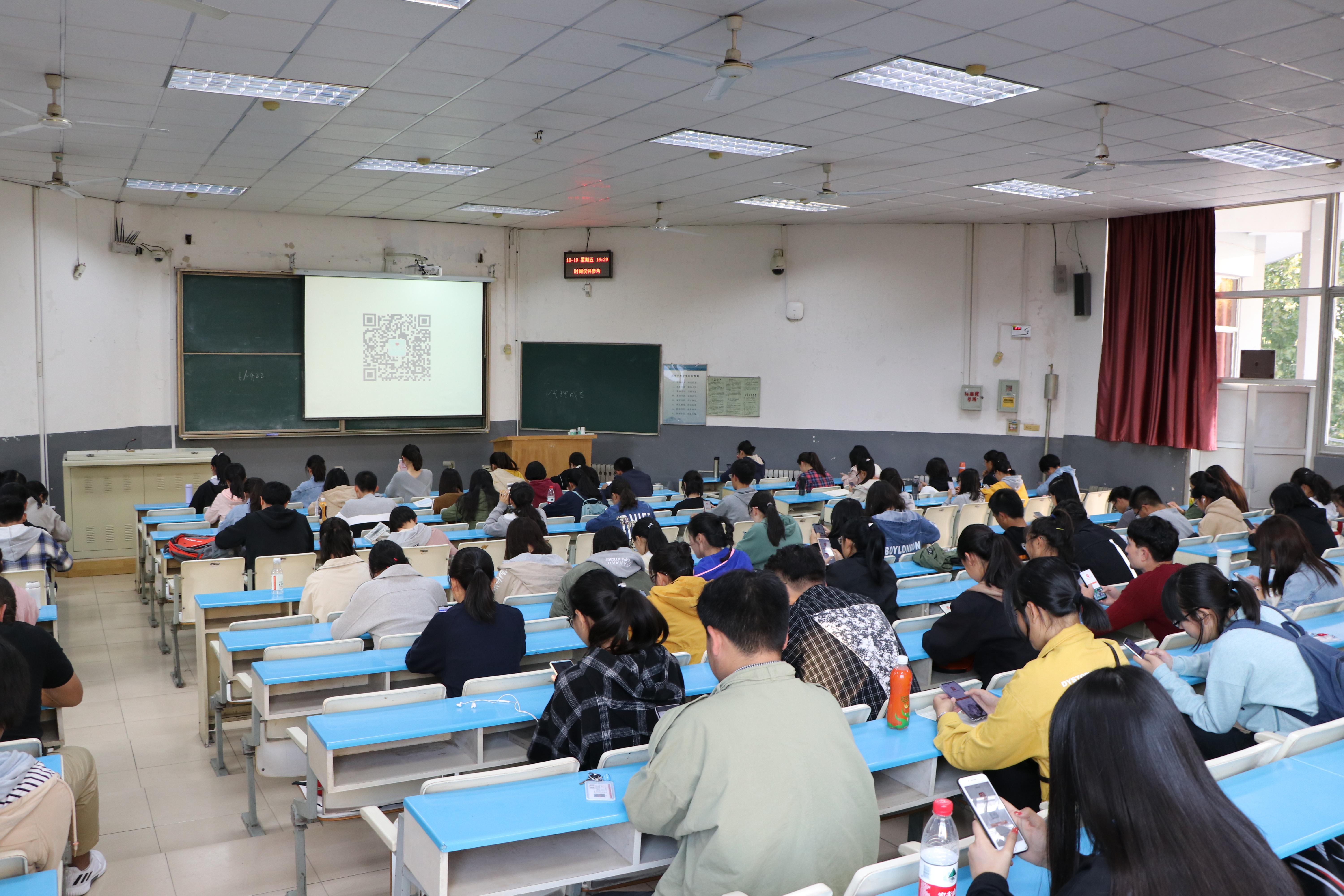 随后同学们分别按照考试座次坐好,通过手机扫码进入心理测试平台完成注册,认真仔细地开始答题。