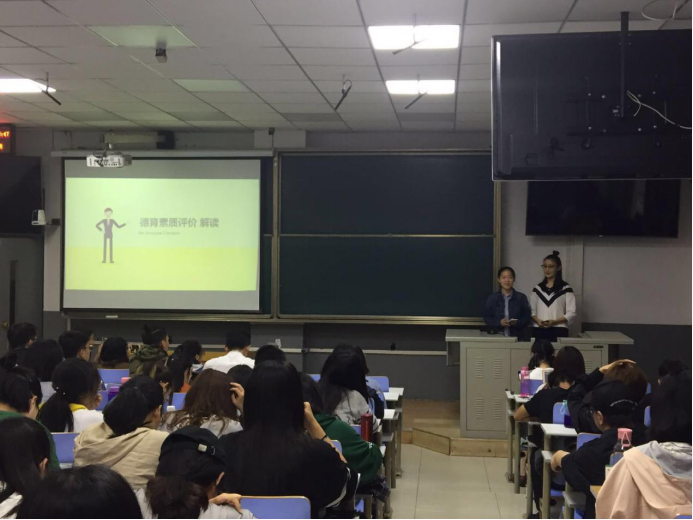 班会首先由一班班长马田对上一学年的大型活动和获得的相应成果做了回顾。随后,一班团支书尚佳和二班团支书王一曌向同学们介绍并详细讲解了新实行的德育素质评价标准。因此评价标准是从2017级开始首次实行,两位团支书带领同学们学习与讲解得格外细致认真,从总则到具体内容、加分情况等一一进行解读,并反复强调了其中一些重点、要点以及加减分的细节,并叮嘱同学们回去后再详细阅读一遍内容,对其中仍有疑惑的地方做出及时的反馈。