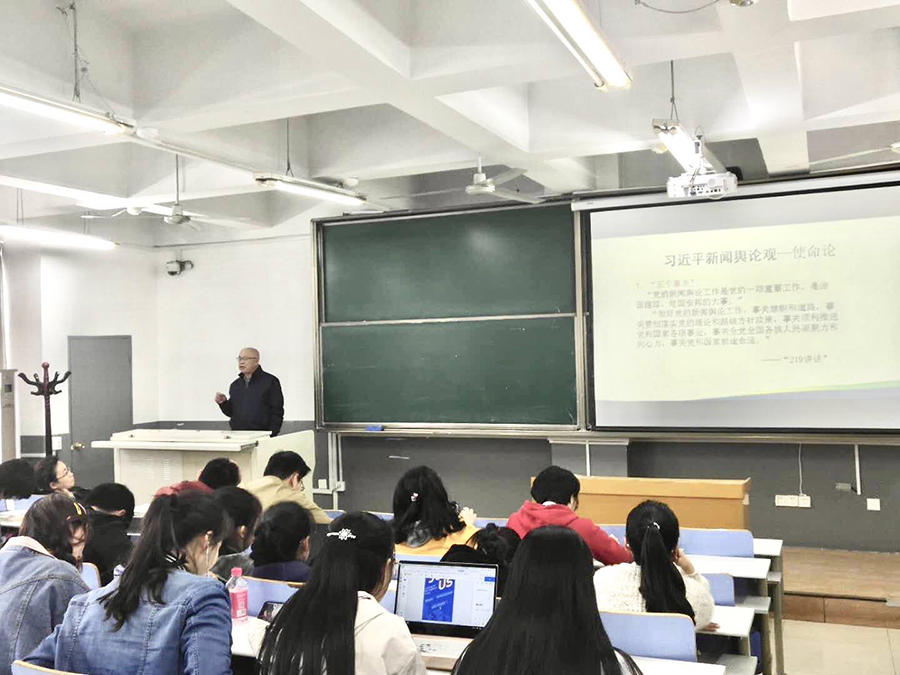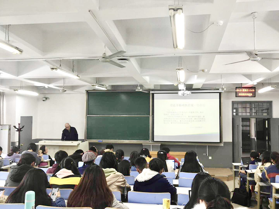 2019年4月25日下午第一节课,BB贝博艾弗森刘明洋教授在BB贝博艾弗森中心校区理综楼411教室为2018级全体员工就习近平的新闻实践进行讲座,讲解剖析习近平关于新闻舆论思想工作的一系列重要论述。