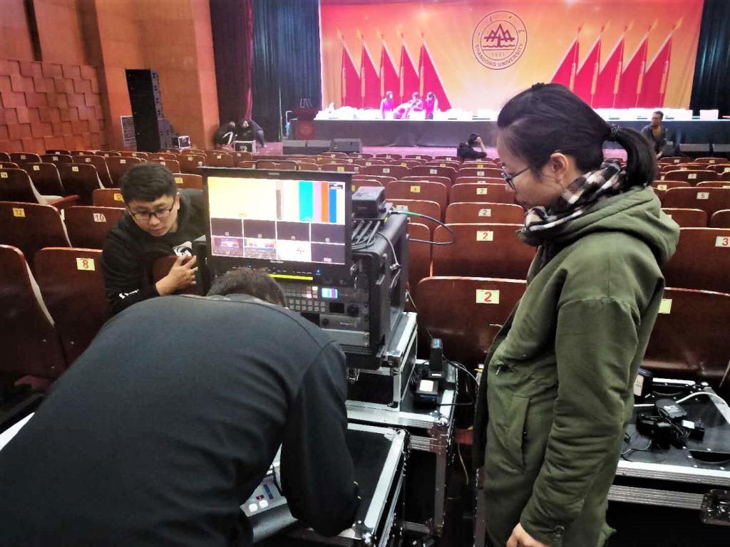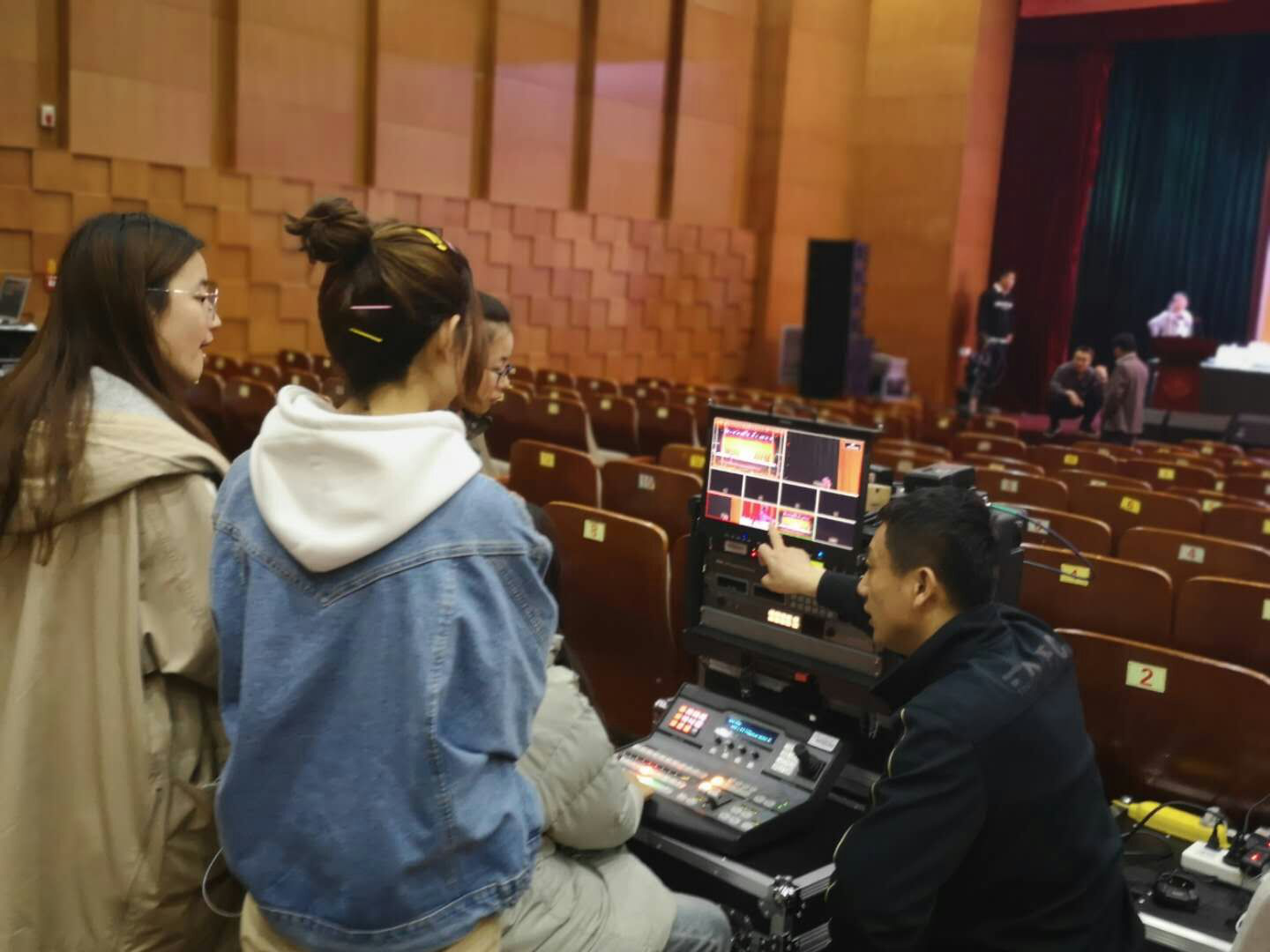 老师同学们正在连接导播台和切换台