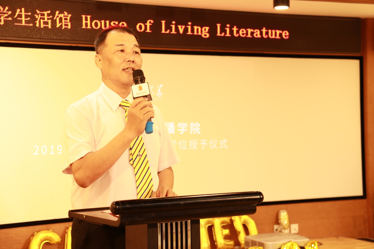 教师代表唐锡光教授发言,嘱托同学们进入社会后,要做好两件事情,其一是管理好自己的欲望,其二是勇于展现自己。除此之外,不要忘记我们的文化背景,百年山大,文史见长。同学们从事媒体行业,应具备严谨细致的精神,以及人文关怀的气质。