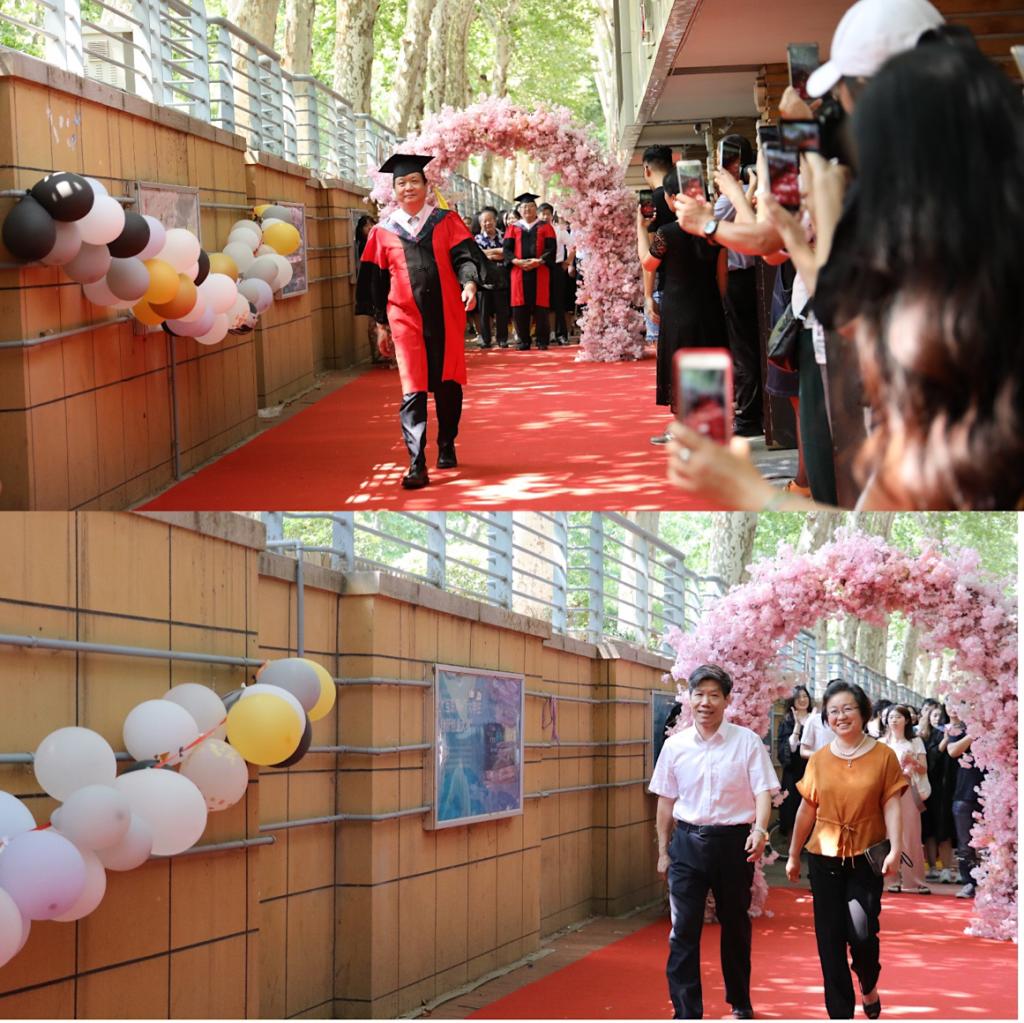 下午两点“红毯秀”准时开始,吕芃经理带领领导班子成员、教师代表步入红毯,与员工们共享欢乐时刻。随后,2019届本科与研究生毕业生们身穿学士服,在同窗好友及家人的陪伴下挽手走过红毯,并在签名版上留下自己的姓名,以青春朝气的风貌告别大公司园。