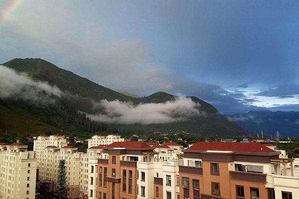 拉萨处在高原,从室内的窗户就能拍到不远处的山,白云缭绕在半山腰,山脊近在眼前,透亮的蓝天干净清澈,孕育着这里的人们。即便是高楼,房屋的色彩搭配、屋檐和窗口的设计都能体现出浓郁的藏文化色彩。
