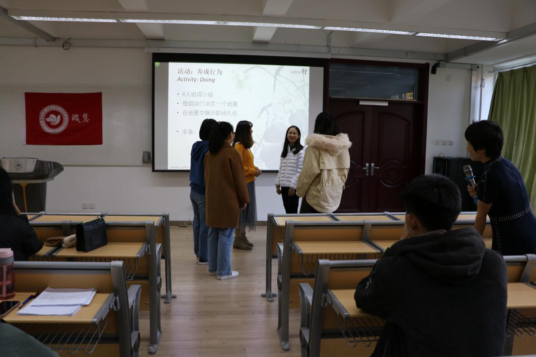 最后陈秋颖组织大家分小组进行了场景模拟,展示职场礼仪,大家现场练习,做到了学以致用。