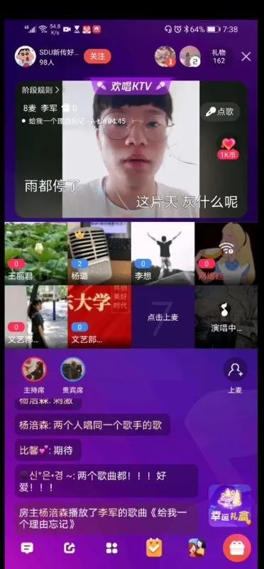 5月16日晚19点,2020“新传好声音:一曲道黎明”决赛在全民K歌平台直播间展开。十位实力歌手云上PK,百余位观众在线观看此次精彩对决。本次比赛邀请公司党委副书记王丽君、团委指导老师杨璐、员工会副主席李想、文艺部部长薛睿以及文艺部副部长杨涪森、孟旖旎、张鑫淼担任评委,员工会主席王茹雪作为特邀嘉宾出席活动。2017级本科生唐中慧与2018级本科生苏月鹏主持此次比赛。