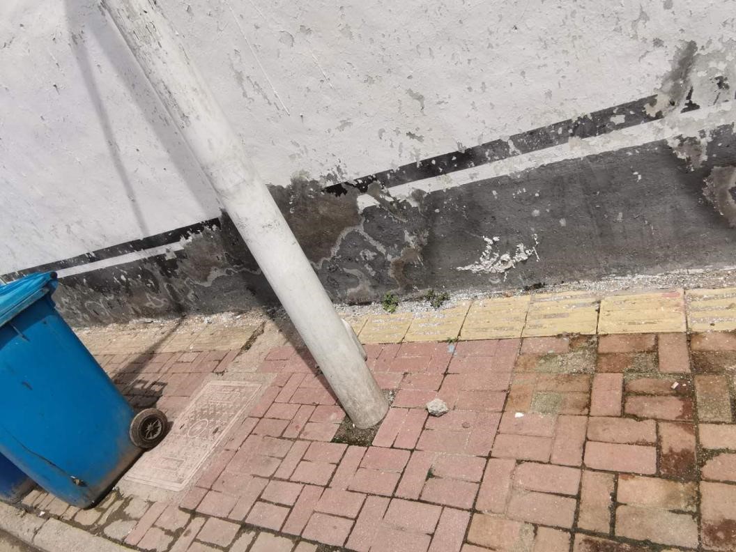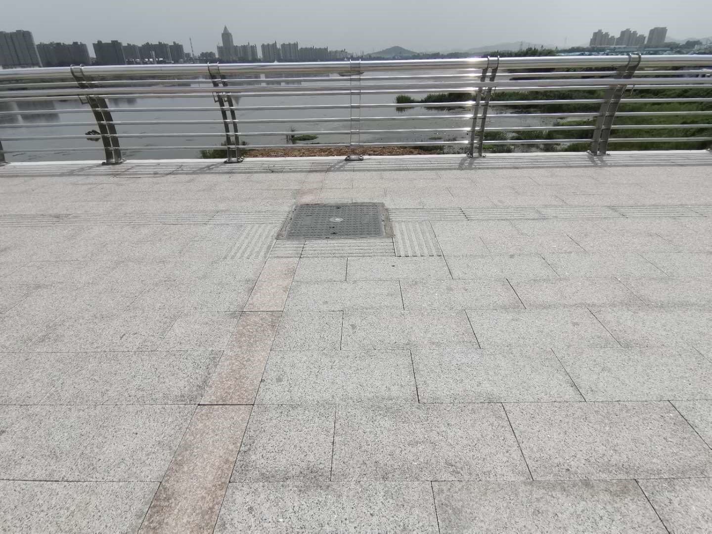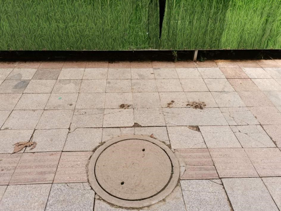 在新建的五环桥两侧有新建的盲道,但是盲道用砖的颜色并不明显,和其他砖色差距不大(青白色),并且尺寸较小,单层砖但砖体较窄。盲道尽头是桥柱和残留的设施坑,存在较大安全隐患。在该处,盲道与下水道井盖的交汇处实施了绕道的盲道设计,然而从实际出发,盲人很难及时反应过来,绕道而行。