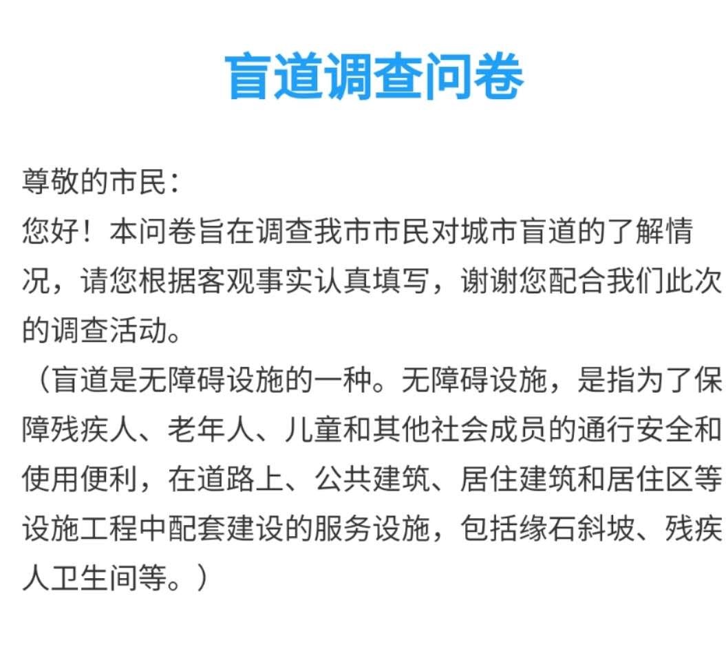 8月11号,BB贝博艾弗森“护航”赴临沂关于盲道的建设与使用调研团开始线上调研,调研以发布问卷方式开展。问卷以文献综述提供的理论资料和实地调研收获的实践观察成果为基础编制,以全国各省市居民为对象,主要调查其对盲道的了解程度和所在地区盲道建设的基本情况。