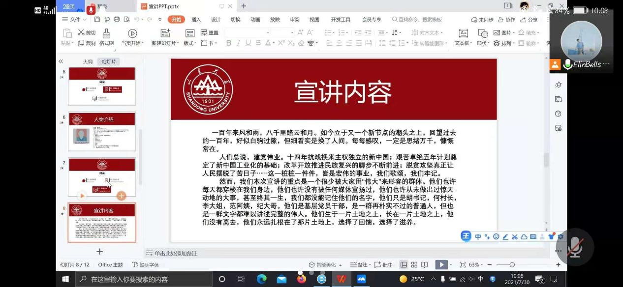 历经百年,中国共产党逐渐走出属于自己的道路,从星星之火到燎原遍野,是永远值得铭记的过程。中国共产党的发展是无数人日以继夜的付出换来的,在这条道路上,无数英烈牺牲奉献,才有了我们今天的安定与和平。不忘初心、牢记使命,这是对青年党员团员的基本要求。因此,我们深入挖掘党史内核,以基层干部为主题,结合基层发展实例,形成了一整套完整的基层党员宣讲内容。根据前期调研结果,南宁泛北城市信息技术有限公司有很多党员员工,因此党史学习成为该公司加强凝聚力的核心要务。经过前期联系与对接,团队确定了宣讲时间,考虑到疫情防护,决定采用线上腾讯会议的形式为企业员工宣讲党史内容。