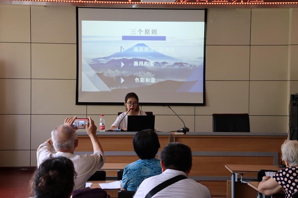 本次活动仍然是以“讲座+互动”的形式开展,由2019级本科生吕睿担任主讲人。首先是关于摄影的基本规则的讲解,吕睿分别介绍了“画面简洁、要素少”、“善用构图”、“色彩和谐”三个原则,并举出不同的照片作为例子,鼓励老人们可以试着现场拍照,将理论与实践相结合。