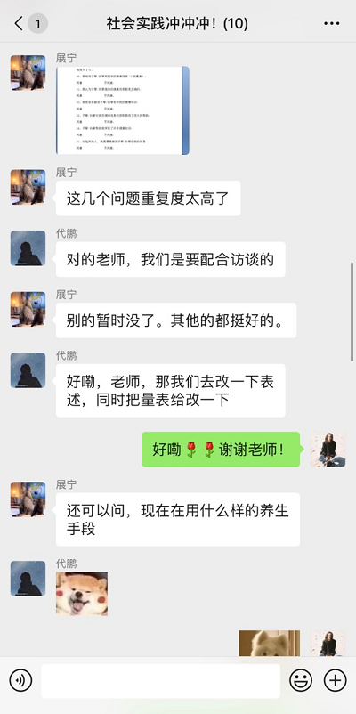 8月2日,受突发疫情影响,团队成员紧急召开了第二次线上会议。由于疫情形势发生变化,成员们首先在问卷发放方式上达成共识,决定采用线上滚雪球的方式进行问卷发放的收尾工作。而针对后续的实践,团队将考虑疫情因素对研究问题与实践的影响,酌情增加线上时间项目,例如对调研结果进行数据可视化展现,通过线上访谈、音频录制、海报设计等形式加强健康知识的科普,提高老年人的健康意识与真假信息辨别能力。