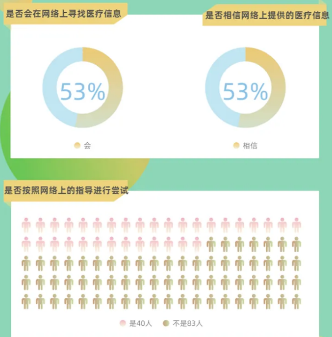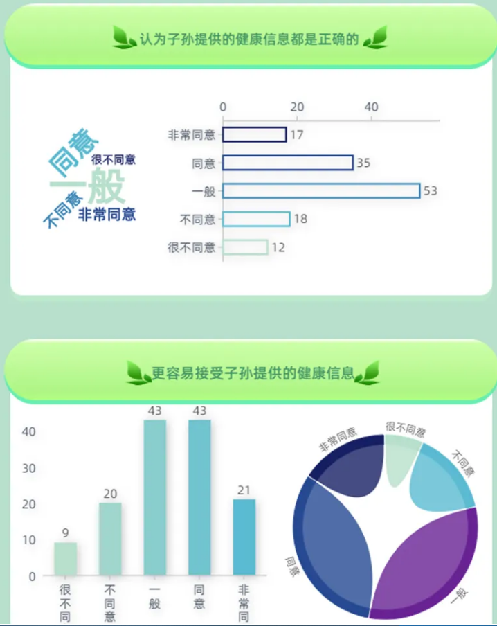 在本次实践中,团队为深入了解互联网时代老年人健康信息素养的现状及原因,对来自山东、天津、福建、江苏四地的152位老年人进行了“一对一”式的问卷调查,并在可靠数据支持的基础上制作了可视化的“老年人健康素养发展报告”,调查对象男女比例均衡、受教育程度分布均匀,数据有效性高。在此报告中,团队不仅囿于表面“伪健康”信息的情况调查,更进一步对代际健康信息传递与意愿进行了深入研究。本次调研的结果给予团队很大启发:分析数据后发现,老年人在互联网时代的健康环境中,因为信息接受的天然弱势,无意中成了科学的健康信息传播的“边缘人”。