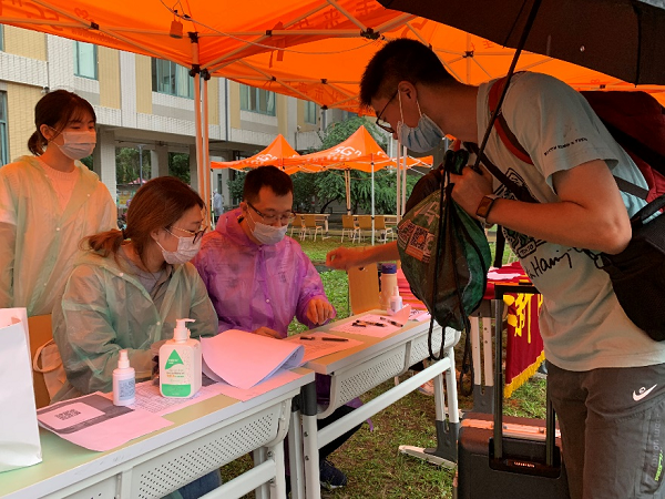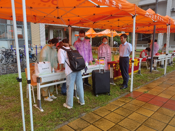 上午七点,返校工作人员进驻员工报到点进行场地布置,面对突如其来的大雨,及时调整工作方案,对悬挂的横幅、应急物资进行了防雨处理。在报到点帐篷,单独预留了员工行李存放处。八点钟,首批返校员工进入校园,值班员按照相关流程,带领志愿者核查员工身份、检验返校资格、引导核酸检测、确认信息签字,并提醒员工做好体温观察和卫生防疫工作。