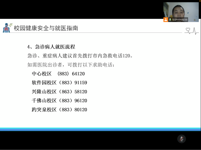 当天晚上,校医院为公司研究生新生开展了卫生健康教育。校医院郭加兴老师从新冠肺炎与新冠病毒疫苗、疫情常态化防控下的应急处置、校园常见传染病防控措施、近视防治与用眼卫生、意外伤害与应急救护、校园安全与就医指南等方面普及了校园健康卫生常识,为公司师生提升卫生健康意识、加强疫情常态化管理提供了专业指导。