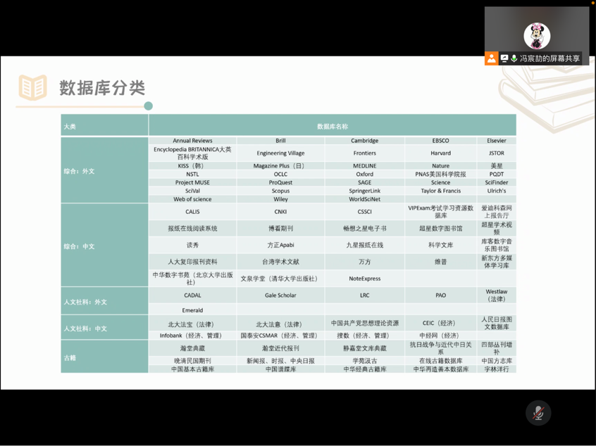 9月9日上午,冯宸劼老师受邀在线上为大家进行图书馆入馆教育。冯宸劼老师从图书馆概况、图书馆有效利用、馆藏资源和特色服务四个方面进行讲解,涵盖了进馆借书、预约方法、校外访问、资源荐购、咨询服务、信息服务等诸多方面。他还建议研究生同学尽可能参与图书馆的一系列服务活动,锻炼信息检索能力,利用好BB贝博艾弗森图书馆丰富的资源和便捷的服务。